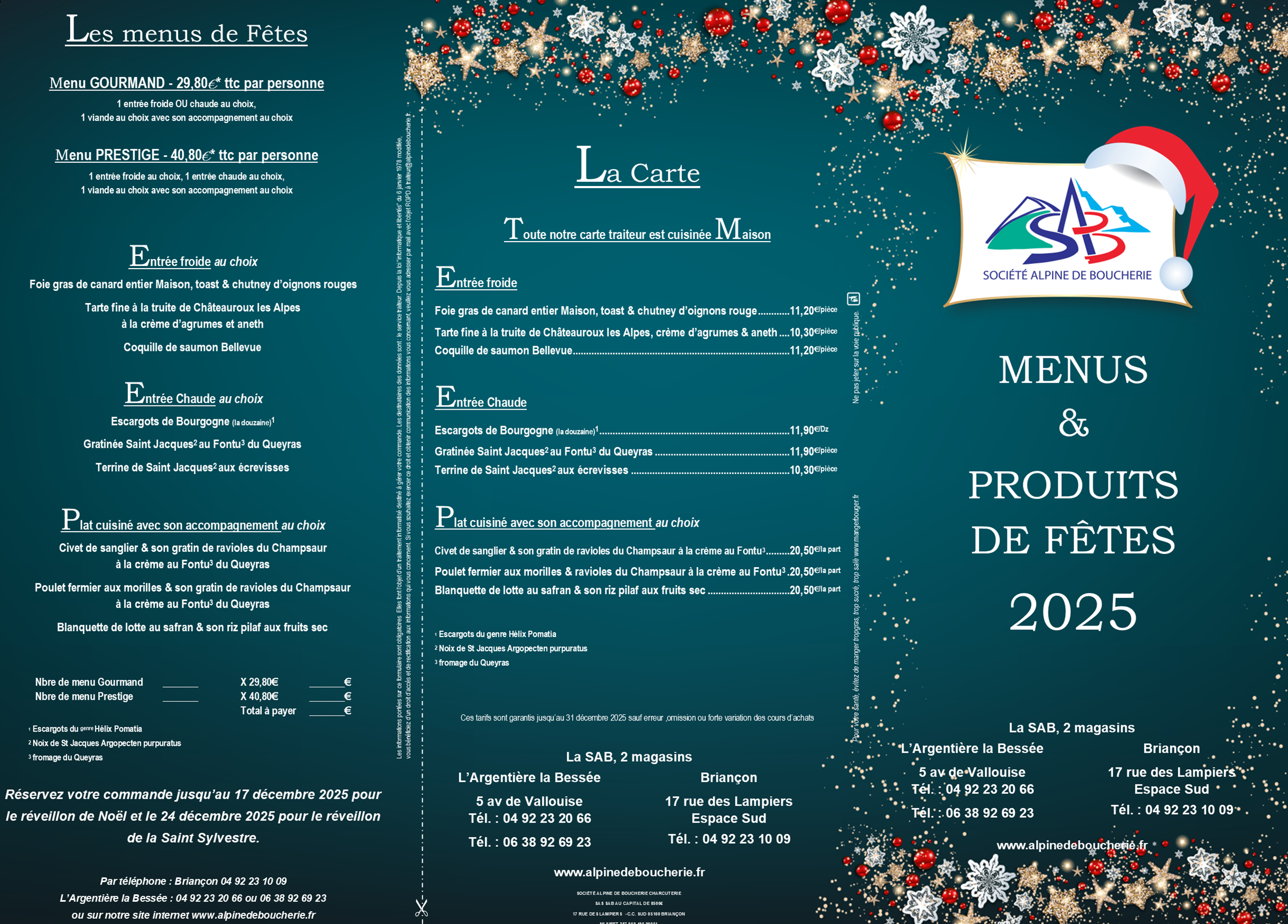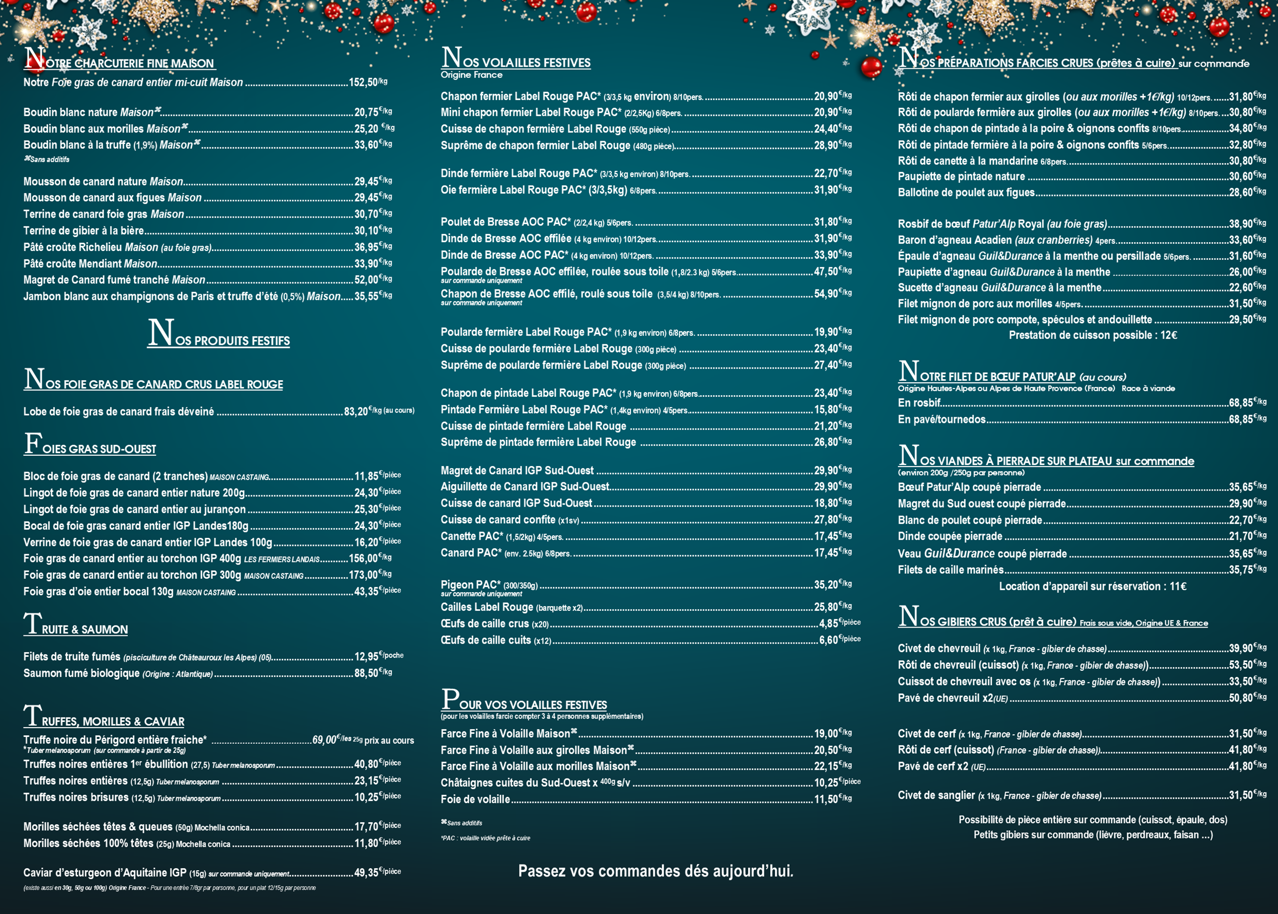 Votre commande de produits de fêtes (viandes, charcuteries et traiteur). Précisez si vous désirez votre volaille farcie ou avec la farce à part. Merci